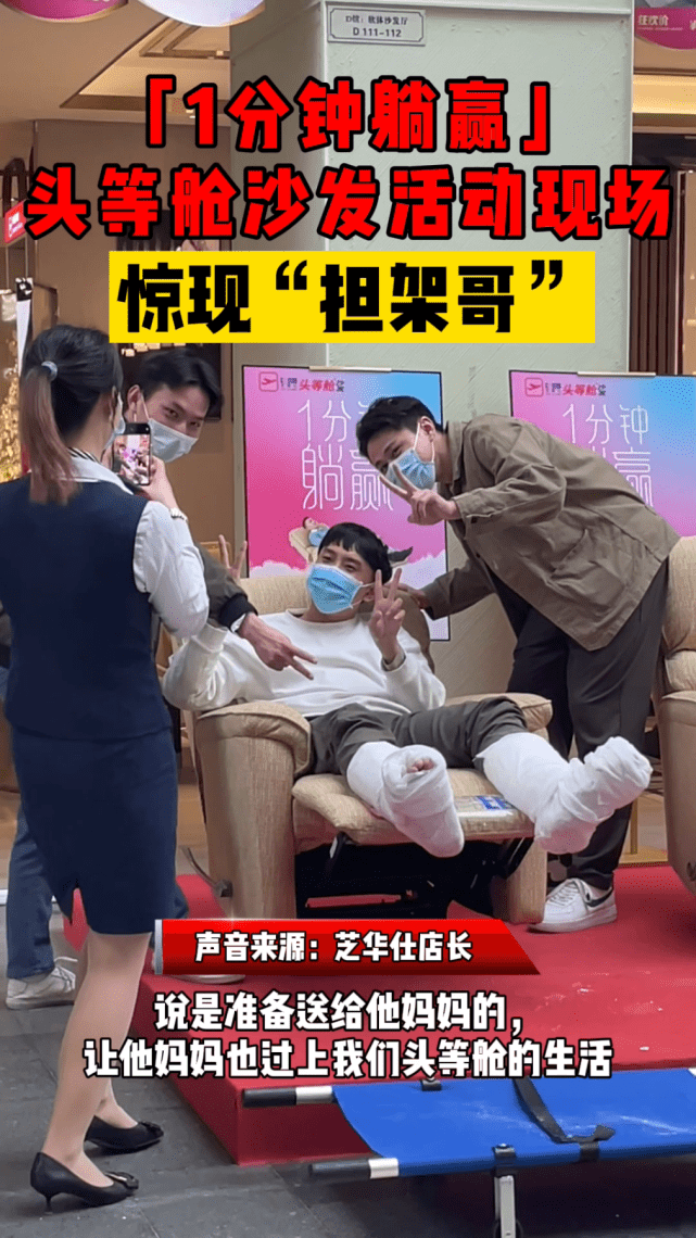 最近,一条网络疯传的视频里,广州一名双腿裹着石膏缠着绷带的小哥,坐在担架上,被朋友抬到了一家芝华仕头等舱沙发体验店的门口,参加活动。