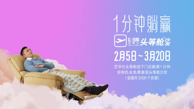 据悉,芝华仕“1分钟躺赢”活动在2月5号就已经在全国的各个城市启动,持续到3月20号。任何人只要进店躺满1分钟,就有机会免费赢得头等舱沙发一张,全国一共5000张。