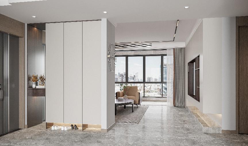 进门处定制到顶式双面玄关柜,容量丰富,放下全家人的鞋绰绰有余。一门到顶,简约大气,底部留空方便换鞋;左侧挖空留出置物台,可摆放艺术装饰品,也可以随手放置钥匙、门卡等常用物品。