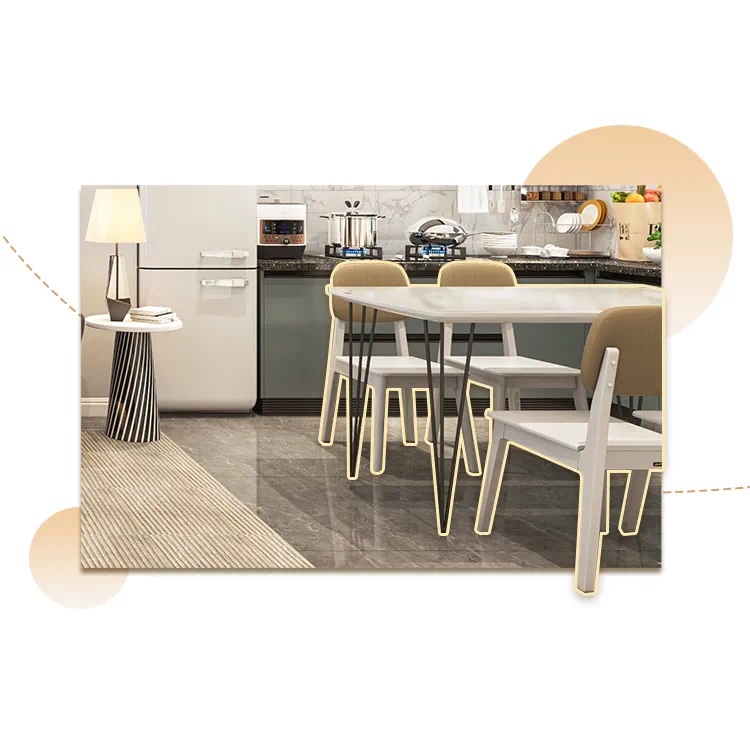 餐桌居中放置,缩短了“备餐—用餐”动线,大理石台面日常清洁很方便,细长金属桌腿轻盈有质感。4-6人位餐椅搭配,偶尔有朋友来小聚也不显拥挤。