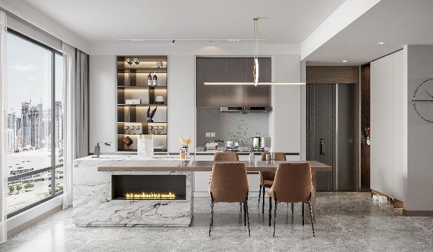 餐厨区是一体开放式设计,在这里,设计师做了“岛台+餐桌”一体式设计,除了能替代餐桌功能,满足基本的用餐,还扩展了厨房备餐空间,让烹饪时刻更从容,同时,也缩短了备餐、上餐动线,就餐更方便。