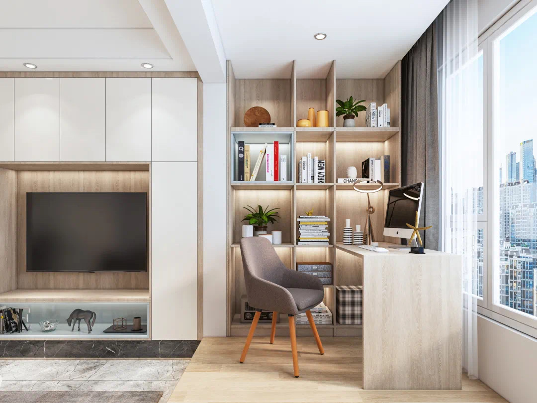 阳台定制一体式书桌柜,为屋主创造出采光良好的办公区。上顶开放式书架,可以放置书籍、盆栽、装饰品,延伸出的书桌方便日常学习、办公。