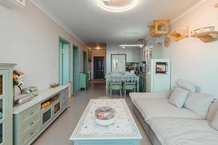 清新的薄荷色家具搭配浅色墙漆,温润弧线+原木隔板,营造法式田园的轻松浪漫,让家充满艺术气息。