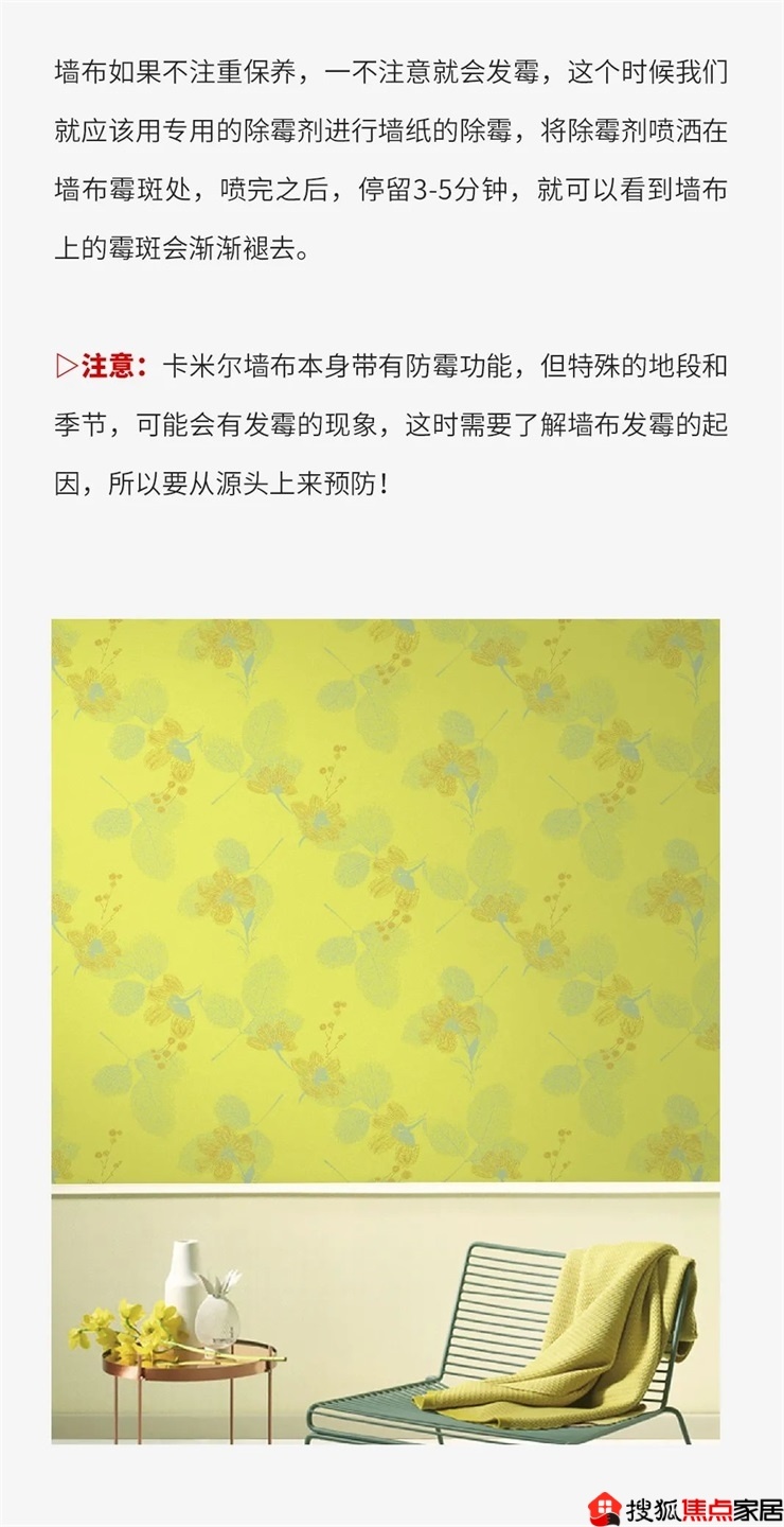 墙布如果不注重保养,一不注意就会发霉,这个时候我们就应该用专用的除霉剂进行墙纸的除霉,将除霉剂喷洒在墙布霉斑处,喷完之后,停留3-5分钟,就可以看到墙布上的霉斑会渐渐褪去。(卡米尔墙布本身有防霉功能,但是根据特殊的地段季节,可能会有发霉的现象,这时需要了解墙布发霉的起因,所以要从源头上来预防!)
