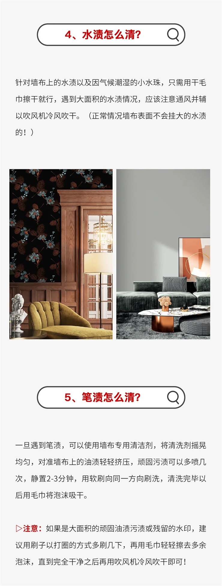 针对墙布上的水渍以及因气候潮湿的小水珠,只需用干毛巾擦干就行,遇到大面积的水渍情况,应该注意通风并辅以吹风机冷风吹干。(正常情况墙布表面不会挂大的水渍的!)