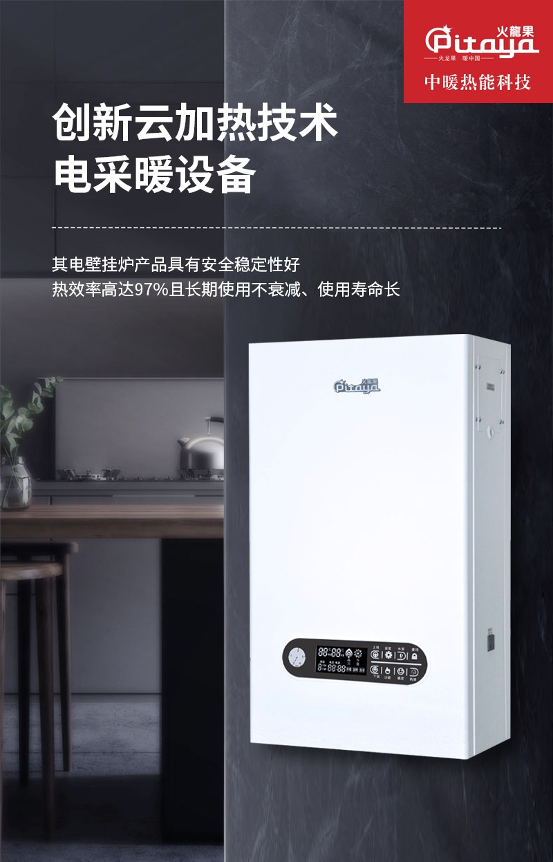 中暖火龍果以技术为先导,研制出创新云加热技术电采暖设备,突破了燃油、燃气、燃煤等有污染的供暖方式,可以与储热容器组合成即用即热供暖系统,其电壁挂炉产品具有安全稳定性好、热效率高达97%且长期使用不衰减、使用寿命长、售后几率少等特点和优势。