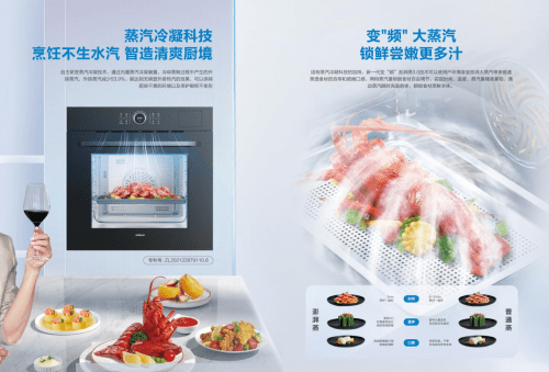 如果说“加汽旋转烤”解决了食物烤不匀的问题,把“烤”这个功能做到了极致,那么控制蒸汽外排的蒸汽冷凝科技和澎湃大蒸汽系统就解决了高温蒸汽外排、食物蒸不透的实际bug,让“蒸”这一功能也同样出彩。
