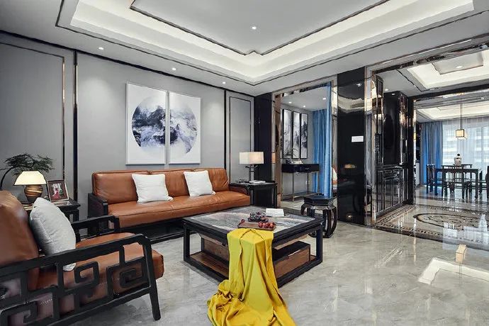 玄关进来就是客厅,沿着吊顶的周围走了几圈线条,让空间的层次感更强,里面的家具几乎都是实木的,充满了典雅与质朴的质感,沙发上铺了棕色皮质坐垫,看上去很有档次,气质一下就被提升了不少。灰色的沙发背景墙简单又大气,再用钛合金线条勾勒出形状,时尚极了,墙面中间用水墨画做点缀,凸显出现代中式的韵味。