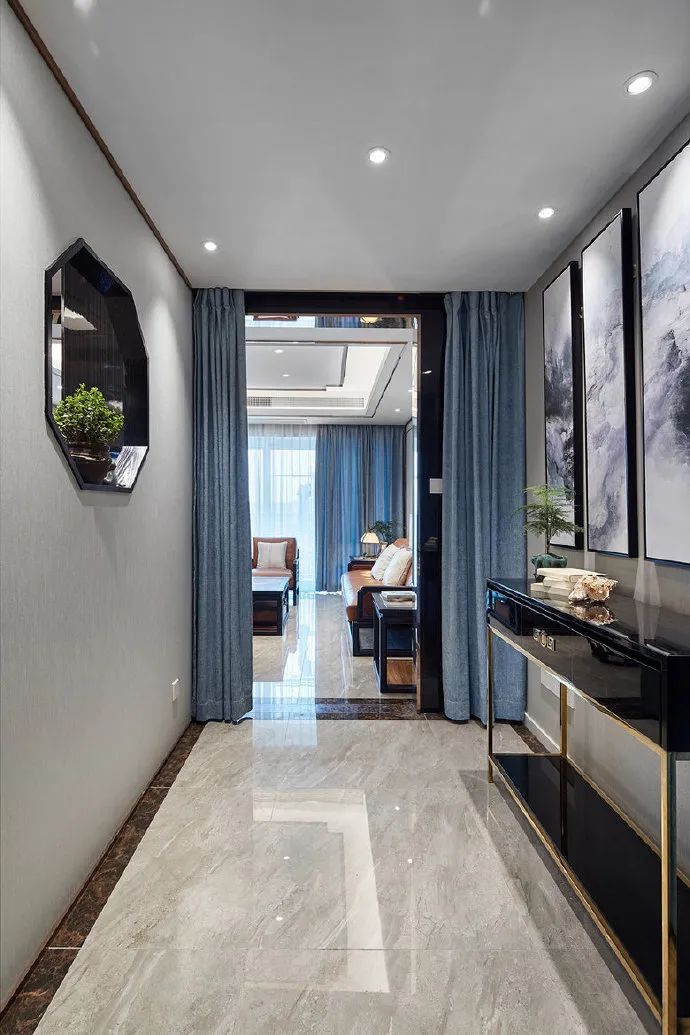 进门有一个独立的玄关,空间还不小,地面铺了灰色大理石瓷砖,纹理很自然,充满了柔光感,在灯光的照射下,更显大气亮堂。左手边打了一个窗洞,起到展示作用的同时引入采光,右边设了一个端景台,上面放了松柏和书籍,略带禅意,具有很好的装饰性,墙上挂了三幅水墨画,充满了中式的雅韵格调,成为入户处一道风景,让人进屋就看呆了。