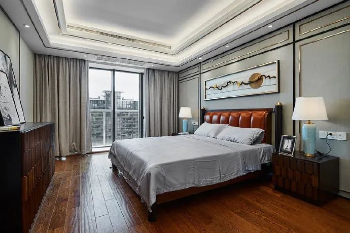卧室的面积挺大的,把阳台打通之后用玻璃门隔断,显得室内通透又明亮。卧室的装修依然是大气上档次,吊顶装了灯带和线条,富有极强的层次感,地面是铺的原木地板,加上原木家具,把卧室的氛围营造得特别温馨舒适,床头背景墙贴了钛合金线条,效果漂亮极了,床尾装了一个斗柜,方便收纳一些家居杂物,搭配两幅装饰画,更有艺术感。