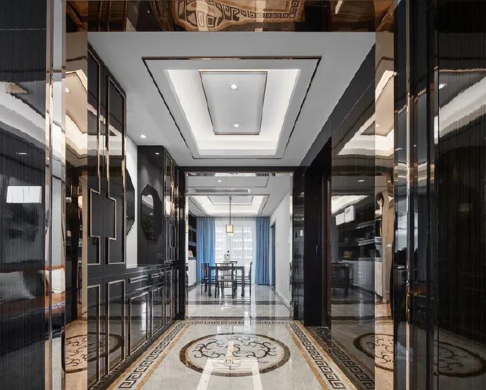 这是客厅进入餐厅之间的一个过道,地上铺了花型图案的地砖,起到非常漂亮的装饰效果,过道两边都做了一些柜子,收纳能力很强,柜子上面用了一些金属线条做装饰,很有档次,整个空间看起来都很豪华的样子。