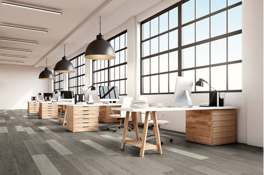 很多办公室会选择铺装地毯,其实地毯并不是最理想的选择。地毯由于材质本身的特点特别容易藏污纳垢,造成细菌的滋生。选择耐磨性能好的地板就不同了,平时不用复杂的打理,简单的清扫就能保持地面的整洁。对办公空间来说,也不需要多奢华的装饰,简洁高效的工作氛围更能带给客户专业的印象。以上图为例,白木结合的整体色调带给人清爽的质感,而卢森地板高级的灰色,提升了整体空间的格调。整个办公空间给人一种明快、充满干劲儿的时尚感。