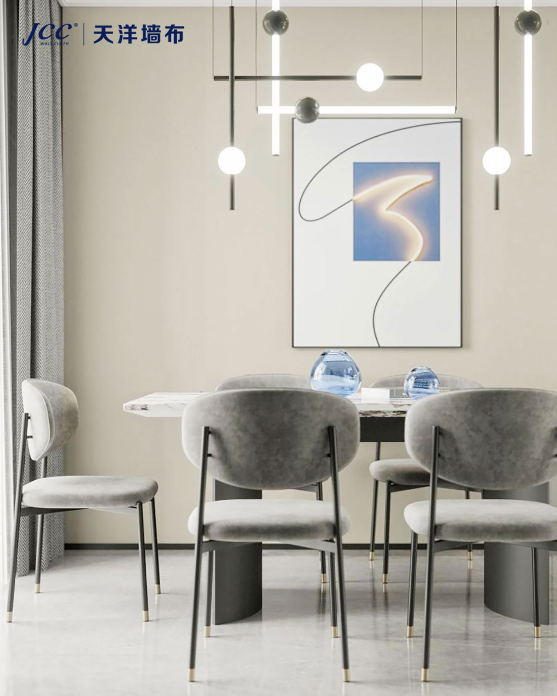 客餐厅用经典小香风格纹墙布作为墙面软装主要饰品,天洋墙布精湛的织造工艺赋予产品高雅的视觉观感与温柔触感,内敛大气的绅士灰与细腻肌理融合,搭配极简风格的家具,释放脱俗的视觉表现力。