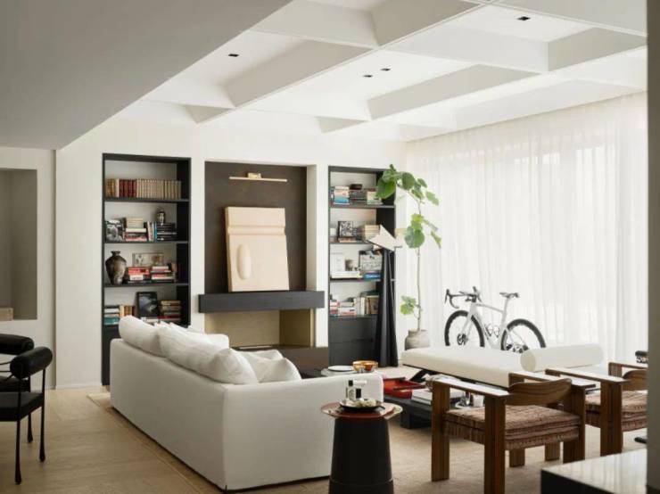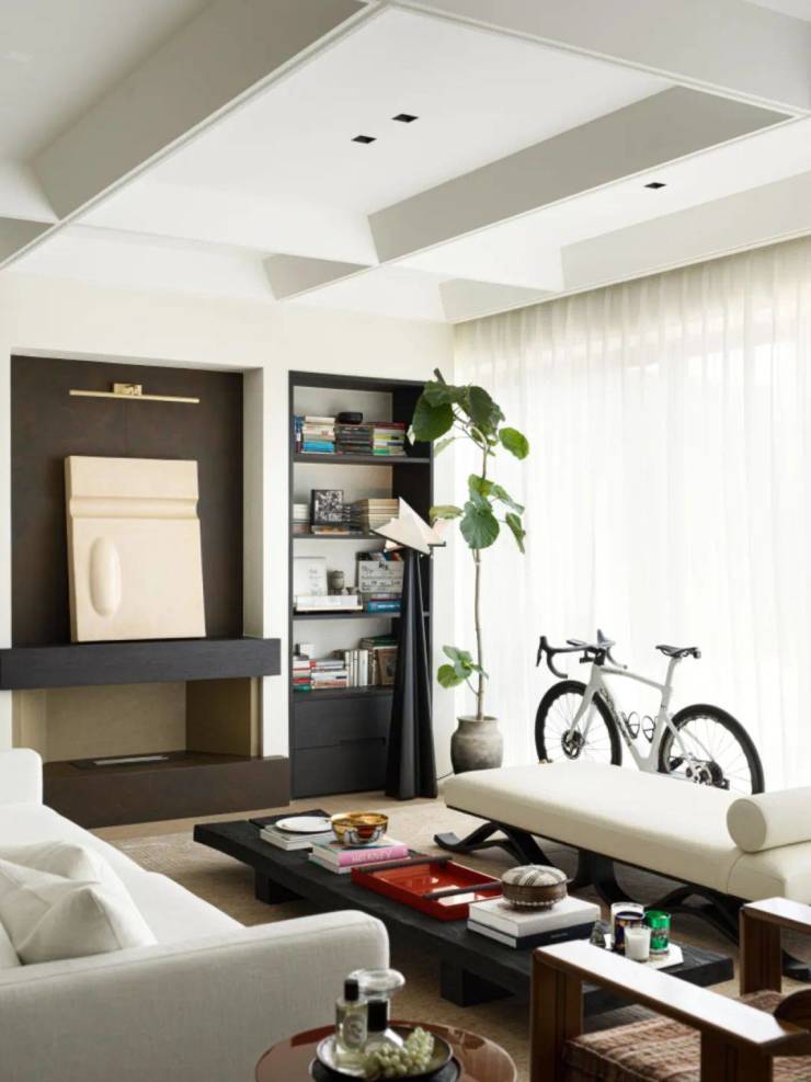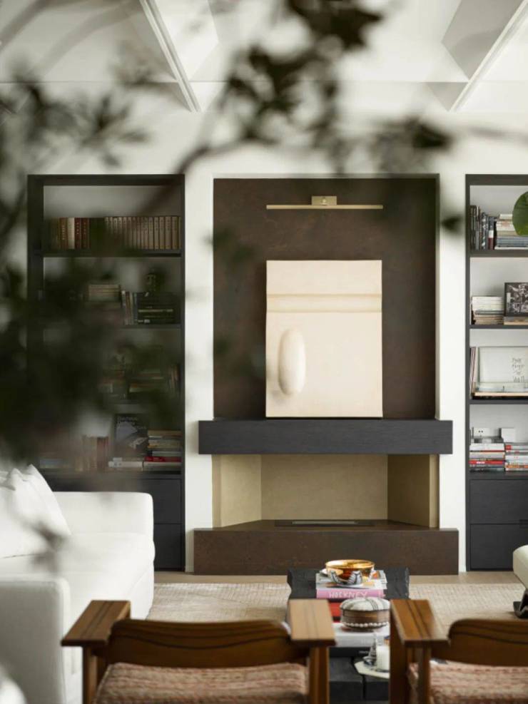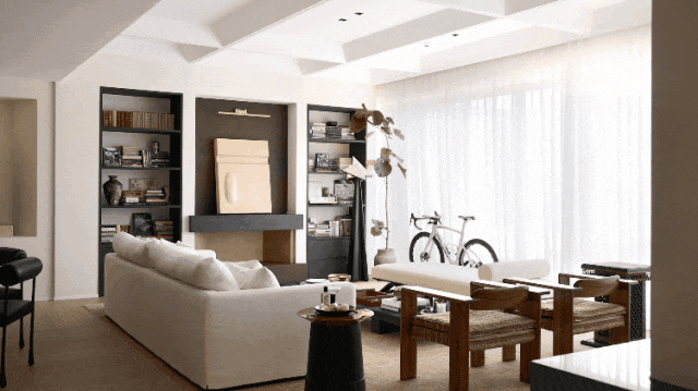 客厅的每一件器物都是花了很多时间精心挑选而来,业主自身颇爱收藏,客厅摆设中有很多是业主的藏品,客厅壁炉上放置着艺术家孙文佳的作品《界01》,展示着万物有灵的哲思和禅意;桌上黑色花瓶则是业主收藏的日本中古花瓶;白色沙发旁边的小茶几则来自LIAIGRE,充满法式品味和风格。