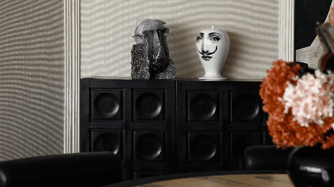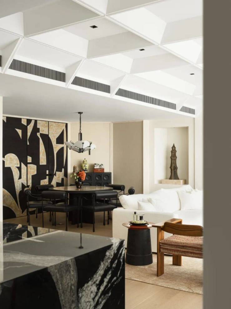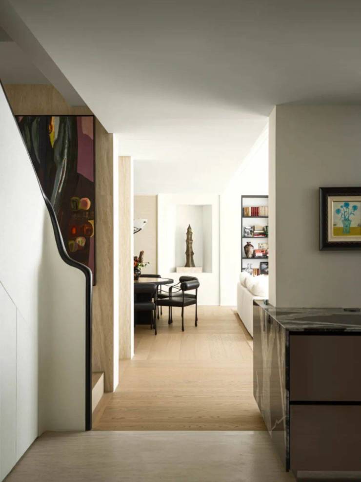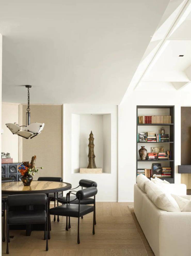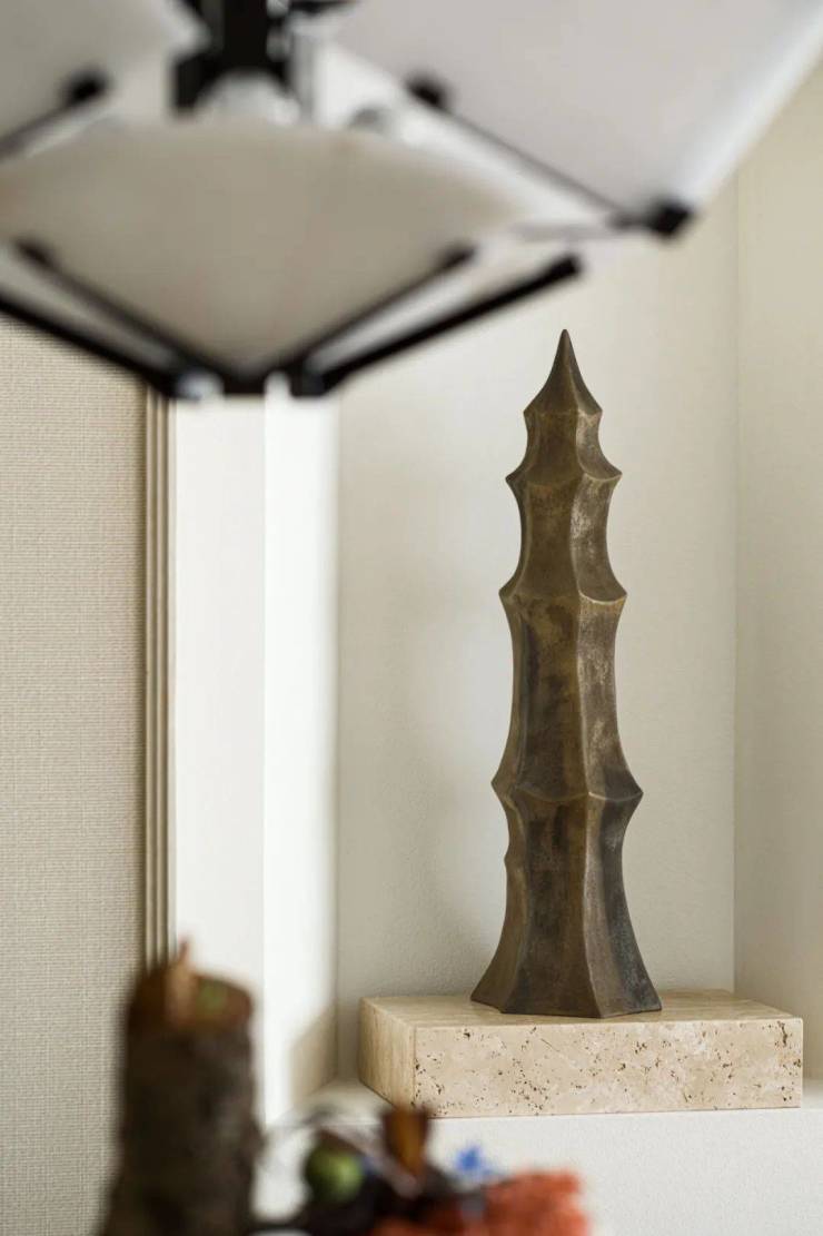 此外,边柜、壁龛、雕塑、器皿、古董、书籍等等,担当了视觉上的调节性元素,无论坐在圆桌哪个方位,都能拥有一幅悦人眼目的构图。客厅和餐厅的差异并置,成就了社交仪式感的一体两面。