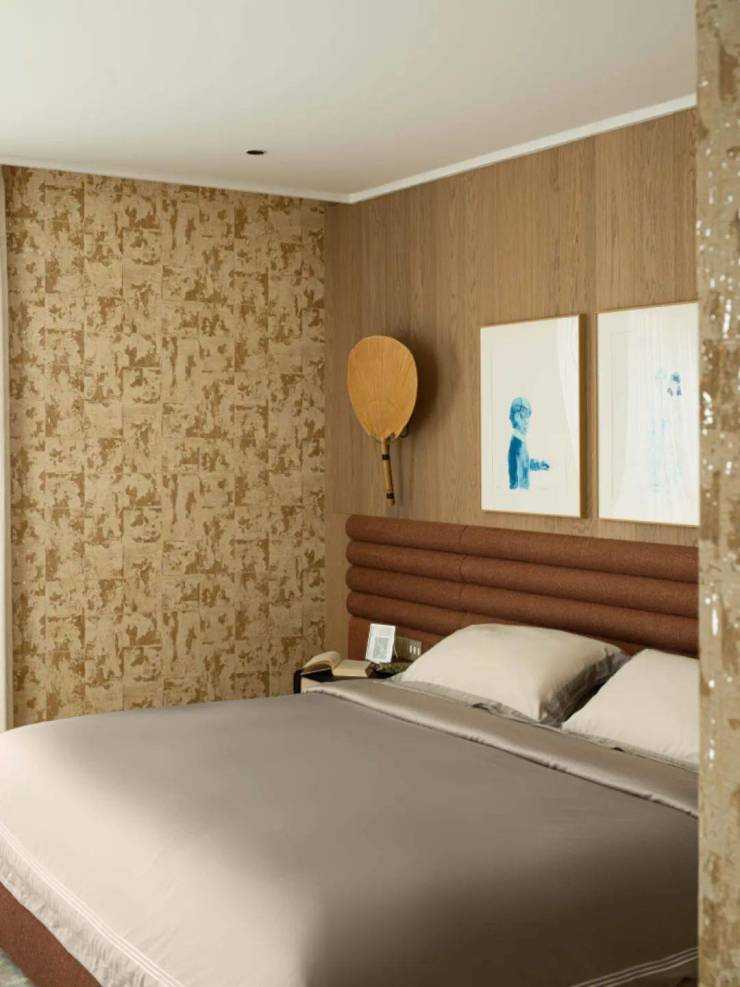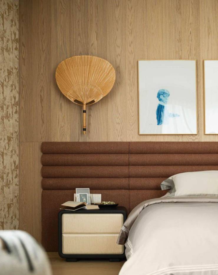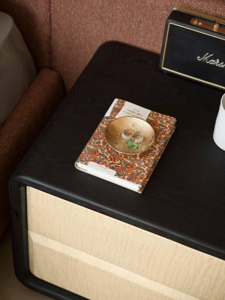 而是爱上中古的生活方式,就要接受她的不完美和瑕疵,接受时间遗留在她身上的印记。在这个承载情感的空间里,所有的器物连接着过去、现在和未来,蕴藏着生生不息,变幻莫测的情绪。壁炉上的艺术品熠熠生辉,床头的蒲扇灯却多了几分写意留白,那是对生活的畅想,是激情热爱,是多巴胺,又或者是一杯让人沉醉的酒。