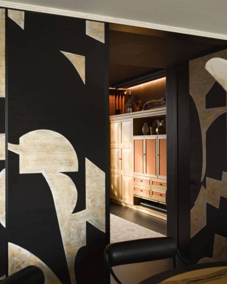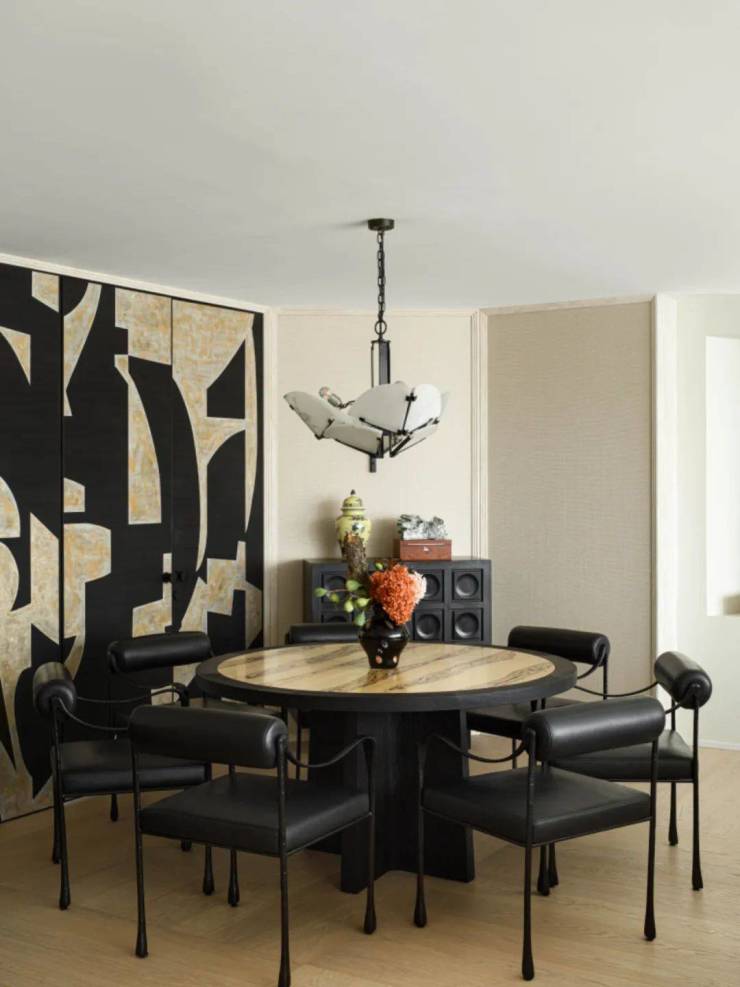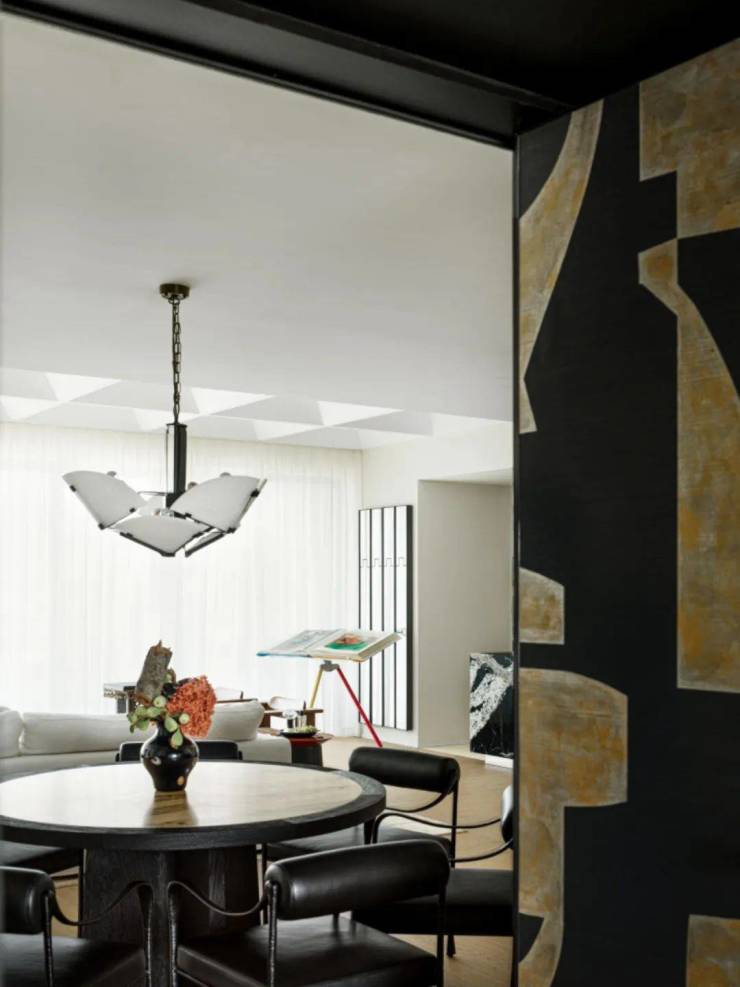 餐厅背靠以屏风为概念的一面门墙,壁纸选用了蒂家丽(De Gournay)的“Symphony”这款可巧妙贴于室内的手绘壁纸,此幅壁纸设计灵感源于20世纪中期雕塑、绘画艺术中的几何形式,巧妙的图案设计、色调与构图塑造令人震撼的场景感,同时构成了餐厅的主视觉所在。