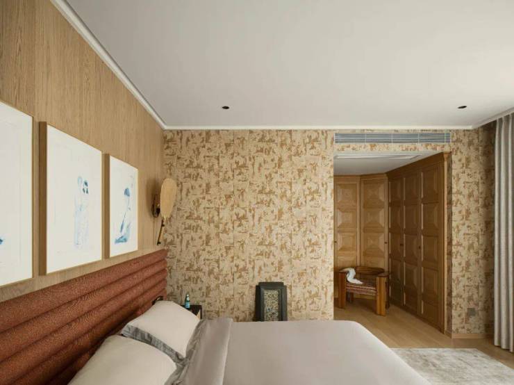 一条复古木质长廊,连接书房、洗手间、衣橱、卧室,整体空间连贯畅通无阻,考虑到业主服饰较多,又不想让衣橱直接呈现,我们用充满几何元素的木质装饰使衣橱与整个家居更融为一体。于业主而言,精心装扮自己的过程,也是追求内心愉悦的过程。