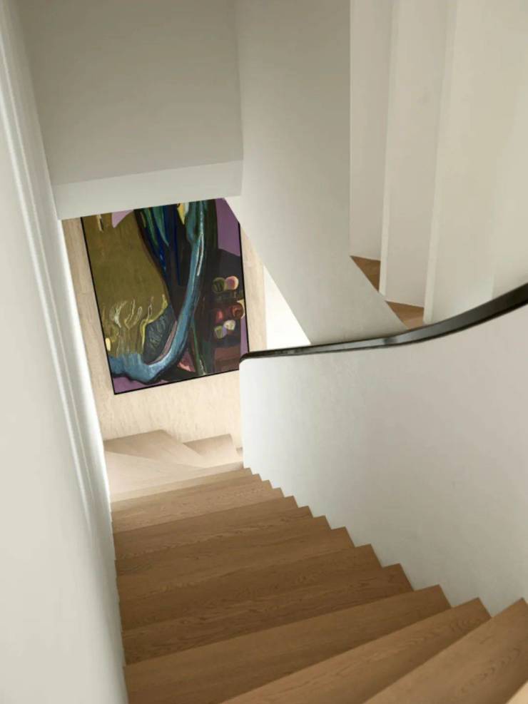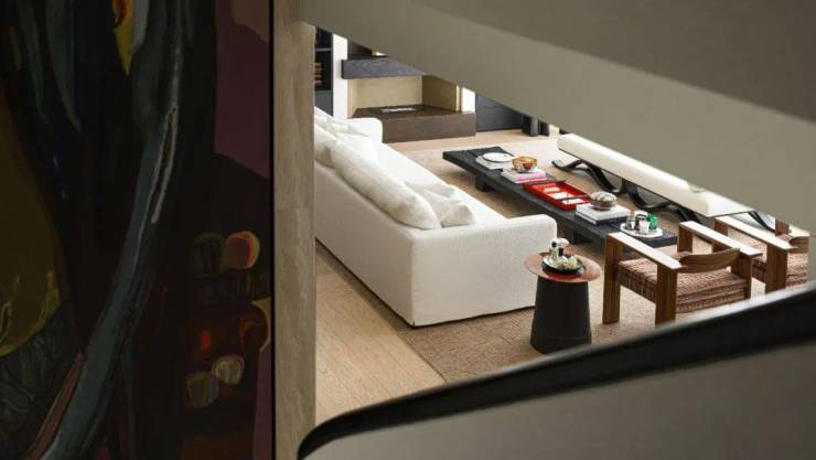 这座理想居所由上下两层构成,一楼是社交的主场所,二楼则是业主休息的区域,我们想通过设计实现生活方式与多元场景的平衡,从楼梯向上,便进入了休息区。