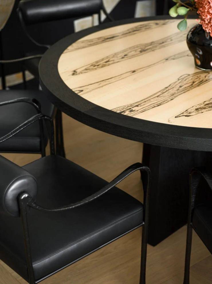 大块面的抽象符号,黑地金纹,精工细作,显示出手艺的分量和稀有质感。黑色木纹肌理的餐桌,造型笔简意足,色泽沉潜低调,触感如琢如磨,堪为场所精神的点睛之墨。餐桌上的花瓶来自意大利名瓷制造商Ginori,一簇鲜花肆意奔放,犹如一切新生和美好的事物是封锁不住,也禁锢不了的。