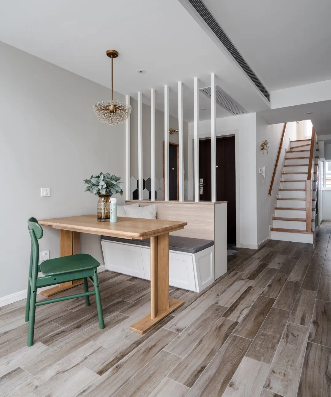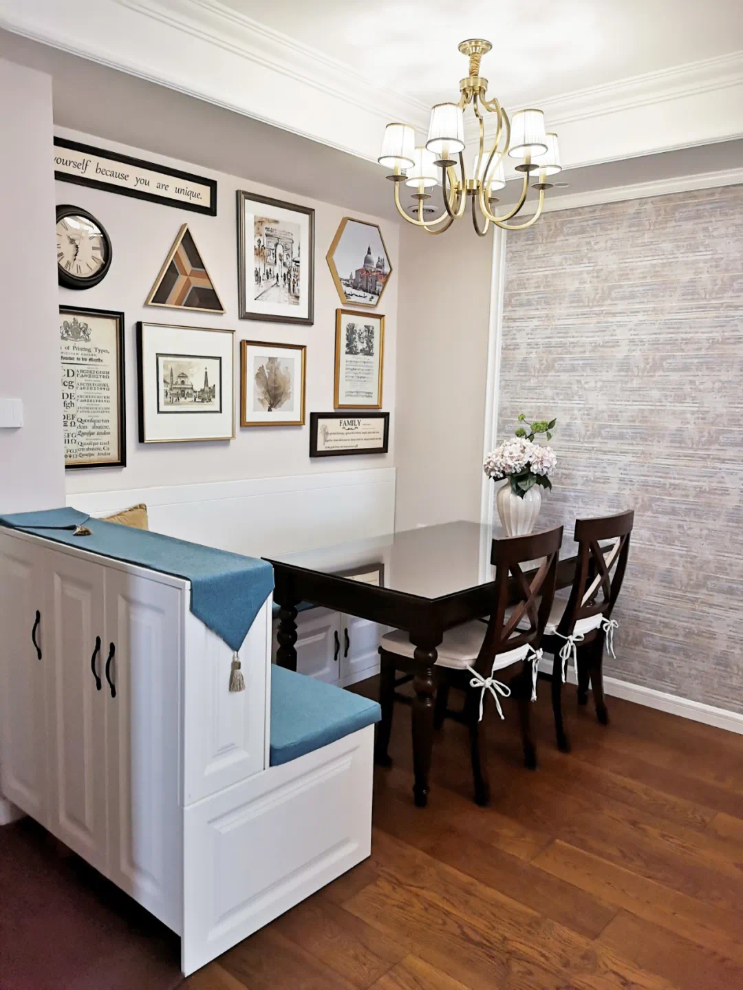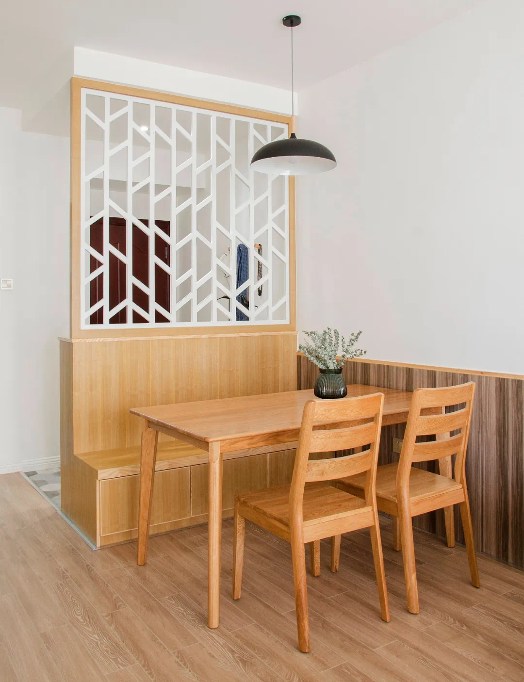 卡座用在餐厅可谓是较常见的做法,在一些家居空间当中,使用了卡座+隔断的组合,不仅可以用来区分餐厅与门厅的不同功能区域,还可以较大程度地让视野开阔,尤其适合于追求小资情调、不甘于常规设计的家庭。