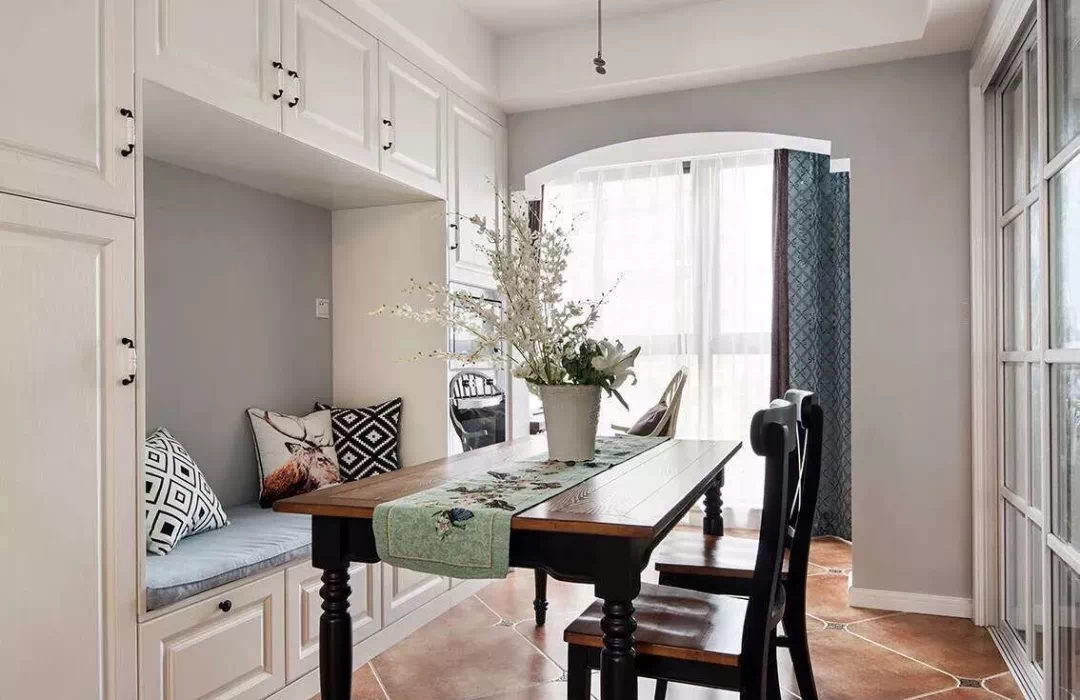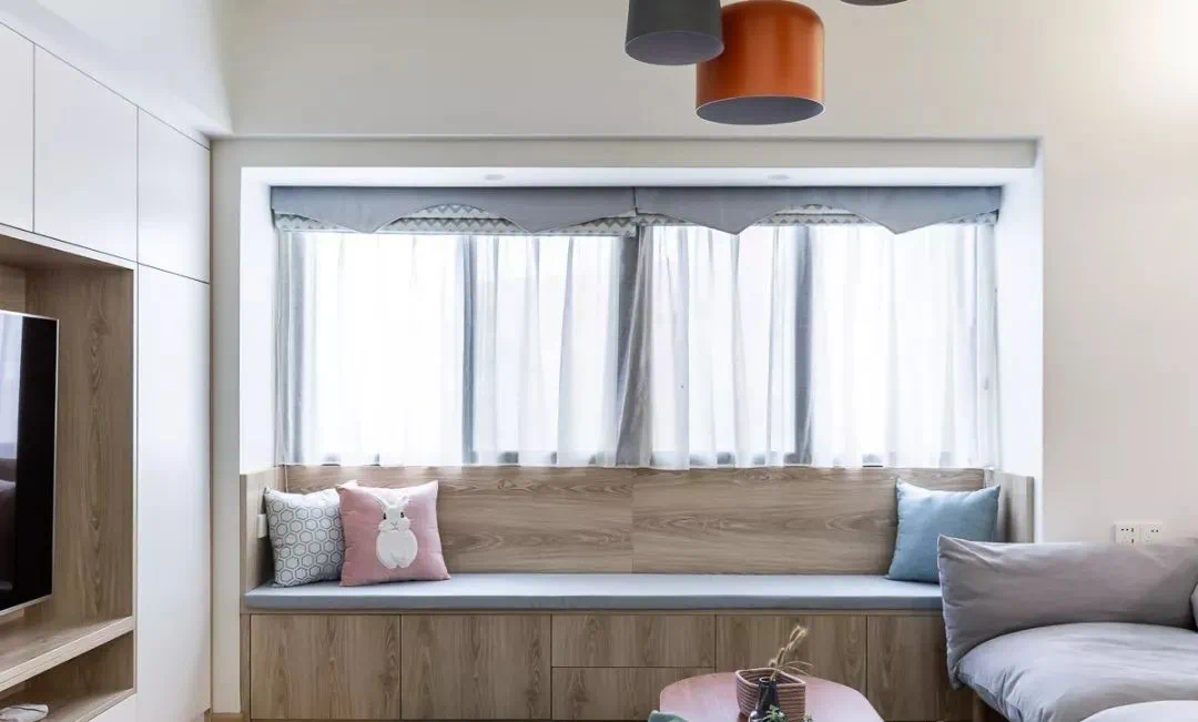 客厅的飘窗,打造成卡座设计,这样处理相当于做多一张超长的沙发。家里来客人了,再也不会没有地方坐了,也是平时休闲放松好地方。