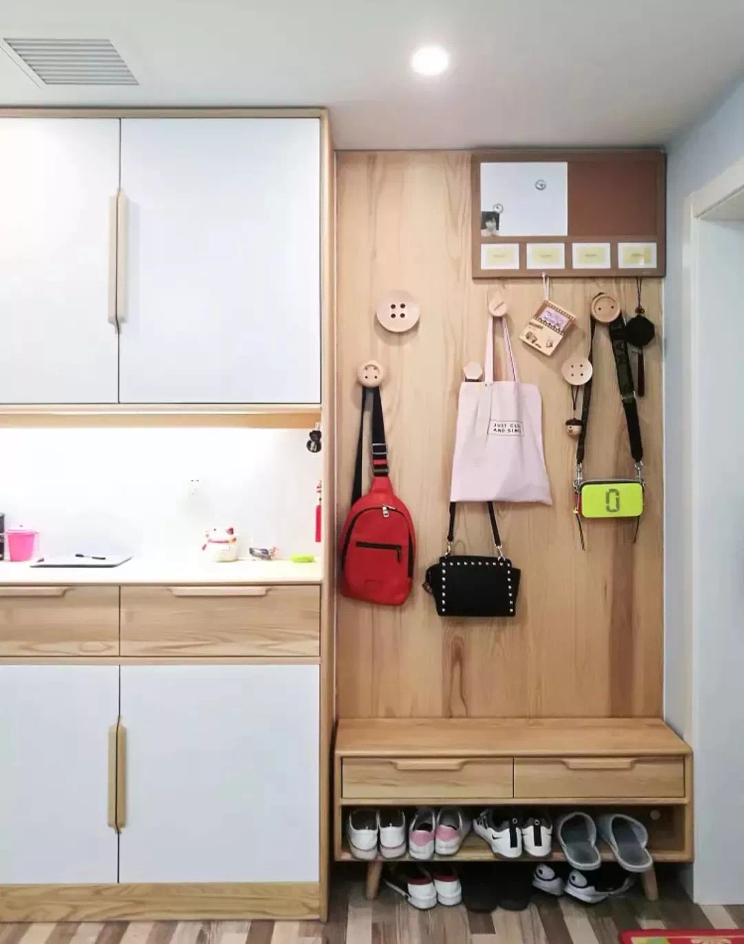 鞋柜加入卡座元素不仅便于在进出门时轻松完成换鞋过程,尤其是对于有老人或者孩子的家庭,安全便捷,同时也增加了门厅空间的储物功能。而鞋柜和卡座的款式装饰与材料质感,要与整体协调统一,保持视觉上的整洁。