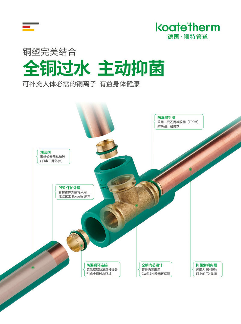 德国阔特koate®therm极奢系列PP-R铜芯管道T2紫铜内层抑菌灭菌率99.99%,而且终生有效;阻氧率100%,遮光率100%,彻底杜绝细菌、微生物、藻类滋生。