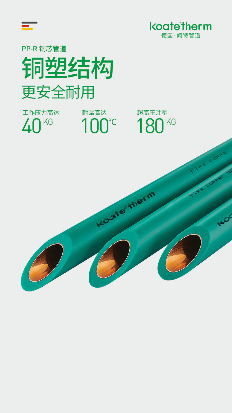 德国阔特koate®therm极奢系列PP-R铜芯管道,外层采用北欧化工PPR原料,绿色、环保、无污染、达到食品安全标准。铜芯覆塑结构,相比纯金属管道可以有效避免家装暗埋时水泥砂浆强碱性对金属的腐蚀,并大大提升了管道的柔韧性。