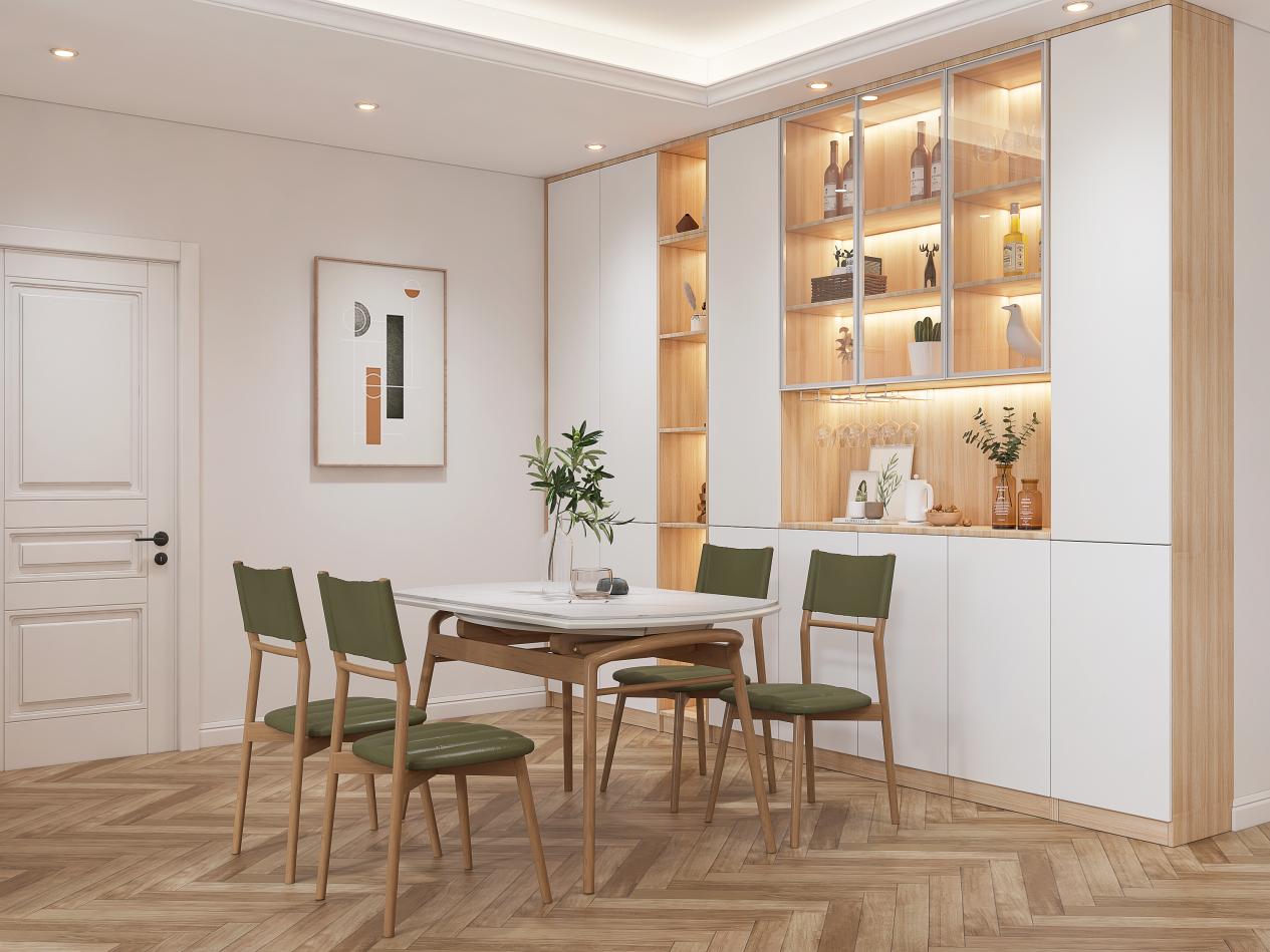 在定制柜体的时候,除了要做成“到顶式”之外,还要遵循“藏八露二”的原则,用20%的空间作为展示区域或者频繁拿放区,剩下的80%都用闭合式收纳,外观看起来整洁干净,内部也不容易落灰。如果全是开放格的话,要清理的就不止一道柜门了。