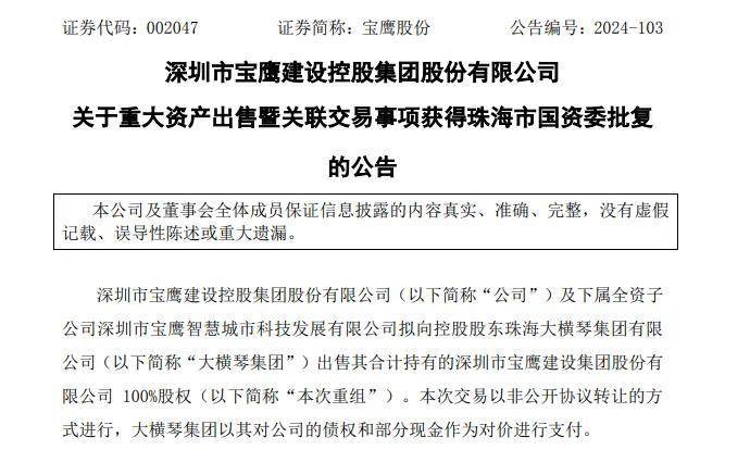 12月6日,宝鹰股份(002047.SZ)公告称,公司及下属全资子公司深圳市宝鹰智慧城市科技发展有限公司拟向控股股东珠海大横琴集团有限公司出售其合计持有的深圳市宝鹰建设集团股份有限公司100%股权。