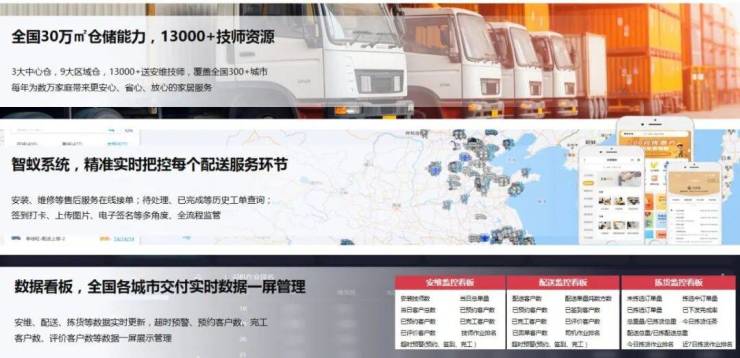 面对当前行业渠道碎片化、服务精细化的趋势,华耐家居通过数字化系统升级,将销售、运输、交付、安维、技师、客服等进行全流程在线化覆盖,实现服务的可视化管理。华耐家居自研的智蚁系统,能够精准实时把控每个配送服务环节,通过数据看板,可以将全国各城市交付实时数据进行管理,提升整体的运营效率。