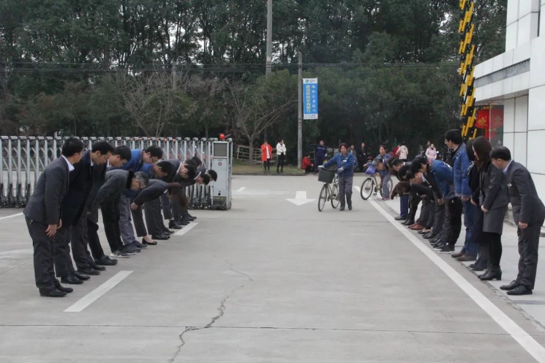 在欧路莎文化室,一张张“特别”的照片引起了众多的关注,照片里,欧路莎的高层管理人员分排站在大门两侧,向前来上班的员工鞠躬示意。